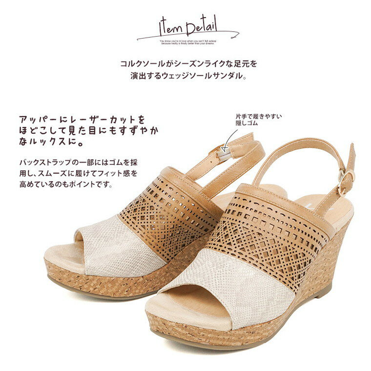コルクソールがシーズンライクな足元を演出するウェッジソールサンダル。