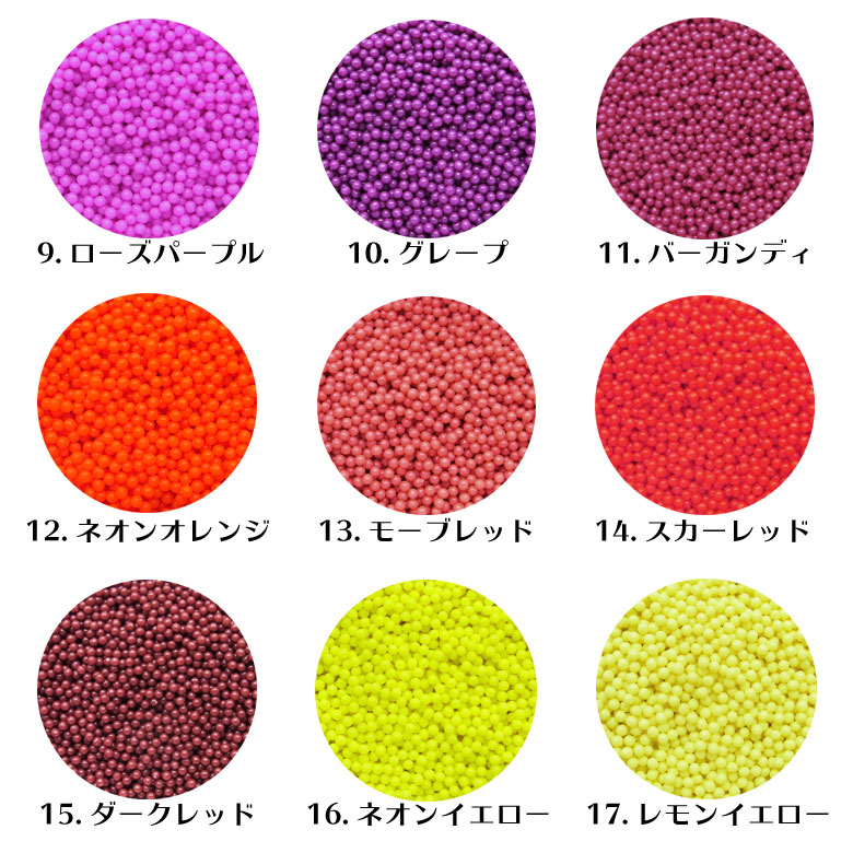 カラー 全39色(1-20) 1.ミルキーコーラル 2.ライトコーラル 3.コーラルピンク 4.ライトピンク 5.ピンク 6.ネオンピンク 7.チェリーピンク 8.ラベンダー 9.ローズパープル 10.グレープ 11.バーガンディ 12.ネオンオレンジ 13.モーブレッド 14.スカーレッド 15.ダークレッド 16.ネオンイエロー 17.レモンイエロー 18.ベージュ 19.マスタード 20.ライトブラウン サイズ・内容量 1mm・・・約0.5g 1.5mm・・・約1g 2mm・・・約1g その他 *まれに色が若干異なるブリオンが混ざっている場合がございます。